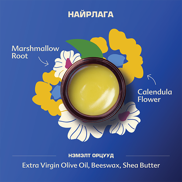Орц: Extra virgin olive oil, beeswax, shea butter, marshmallow root, calendula flower.